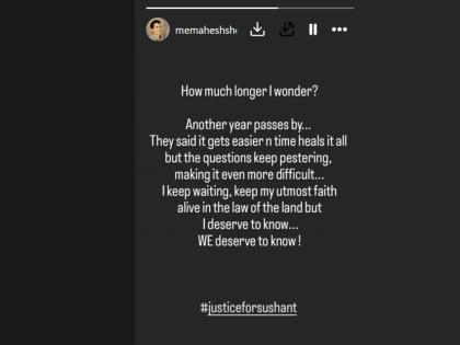 सुशांतसिंह राजपूतने आत्महत्या का केली? त्याला आत्महत्या करण्यास कोणी प्रवृत्त केले होते का? त्याची हत्या झाली का? असे अनेक प्रश्न आजही अनुत्तरित आहेत. सुशांतच्या प्रकरणाचा तपास सीबीआय (CBI) करत होतं पण काहीच पुरावे हाती न लागल्याने केस क्लोज झाली. अभिनेता महेश शेट्टीने मित्राच्या आठवणीत लिहिले,"अजून किती काळ? आणखी एक वर्ष सरलं. असं म्हणतात गोष्टींना वेळ दिला की सगळं ठीक होतं. पण सततचे प्रश्न या गोष्टी अजून कठीण करत आहे. मी वाट बघतोय, कायद्यावर विश्वास ठेवतोय पण मला सर्वकाही जाणून घेण्याचा हक्क आहे. आम्हाला सगळं काही जाऊन घेण्याचा हक्क आहे. #JusticeForSushant"