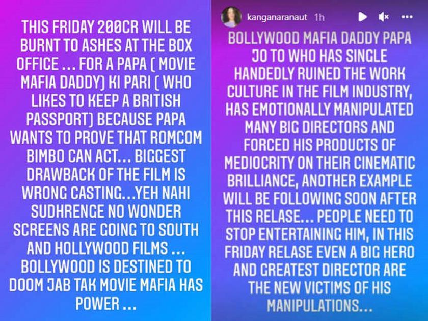 दुसऱ्या स्टोरीमध्ये ती लिहिते, बॉलिवूड माफिया डॅडी पापा ज्याने एकट्यानेच फिल्म इंडस्ट्रीची संस्कृती बदलवून ठेवली. त्याने अनेक बड्या दिग्दर्शकांसोबत चतुराईने गेम खेळत सुमार प्रॉडक्टला त्यांच्या माथी मारलं. या चित्रपटाच्या रिलीजनंतर याचं आणखी एक उदाहरण समोर येईल. लोकांनी यांना पाहणं बंद केलं पाहिजे. या शुक्रवारी एक मोठा हिरो आणि एक महान दिग्दर्शक त्याच्या डावपेचाला बळी पडलेले असतील, असं कंगनाने म्हटलं होतं.