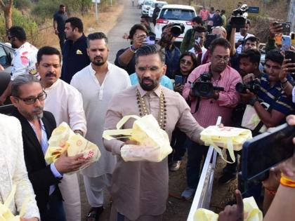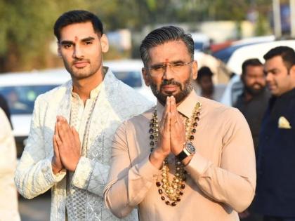 सुनील शेट्टी मीडियाला भेटायला आला होता. तिने पेस्टल गुलाबी रंगाचे धोतर आणि कुर्ता घातला आहे. सुनीलसोबत त्याचा मुलगा अहान शेट्टीही दिसला. दोघांनी पापाराझींना मिठाई दिली.