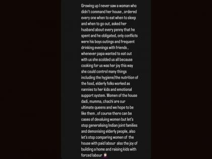 कंगना रणौतने तिच्या इन्स्टाग्राम अकाऊंटवर 'मिसेस' सिनेमाबद्दल तिच्या मनातील भावना व्यक्त केल्या आहेत. कंगना लिहिते की, "मी मोठी होत असताना कधीही अशा महिला बघितल्या नाहीत ज्यांचा घरात स्वतःचा अधिकार नाही. याशिवाय कधी जेवायचं, झोपायचं, बाहेर जायचं याबद्दल या महिलांचं काही मत नाही, असंही मी पाहिलं नाहीये. जेव्हा बाबा आम्हाला घेऊन बाहेर जायचे तेव्हा आई त्यांना ओरडायची. कारण आईला आमच्यासाठी घरी जेवण बनवायला आवडायचं. माझ्या घरातील काकी, नानी आणि घरातील सर्व महिला या राणी आहेत. महिलांना कामगार म्हणणं बंद करा. घरातील काम आणि मुलांना सांभाळण्यामध्ये एक आनंद असतो. त्या गोष्टीला जबरदस्ती म्हणू नका."