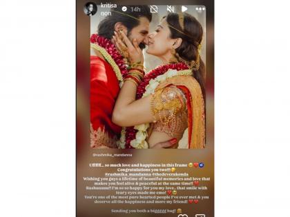 क्रिती सेननने आपल्या इन्स्टाग्राम स्टोरीवर या नवविवाहित जोडप्याचा फोटो शेअर केला आहे. तिने लिहिले, "उफ्फ्फ... या फ्रेममध्ये किती प्रेम आणि आनंद भरलेला आहे! रश्मिका आणि विजय, तुम्हा दोघांचे खूप खूप अभिनंदन. तुम्हाला आयुष्यभर अशा सुंदर आठवणी आणि प्रेम मिळो, ज्यामुळे तुम्हाला सदैव शांत आणि उत्साही वाटेल."