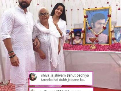 ‘वाह रे सोशल मीडिया, तेरावीचेही फोटो काढता आणि ते सुद्धा हसत,’ असे एका युजरने लिहिले. दु:ख व्यक्त करण्याची ही चांगली पद्धत आहे, असे एका युजरने उपरोधिकपणे लिहिले. तेरवीचे फोटो अपलोड करणे गरजेचे होते का? असा संतप्त सवाल एकाने केला. तर अन्य एका युजरने, किमान विक्रांतकडून ही अपेक्षा नव्हती, असे लिहित आपला संताप बोलून दाखवला. अनेकांनी मोनालिसा व तिच्या पतीला हा तेरवीचा कार्यक्रम आहे, सिनेमाचा इव्हेंट नाही, हे लक्षात आणून दिले. अनेकांनी शो आॅफ करू नका, थोडी तर लाज बाळगा असा सल्ला त्यांना दिला.