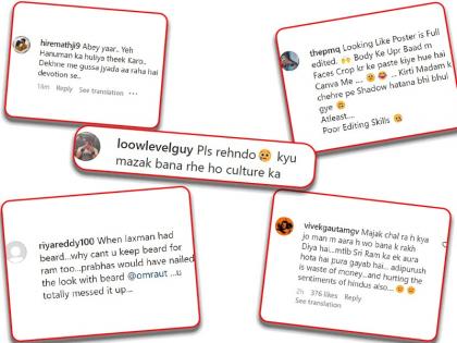पोस्टरमधल्या एक ना अनेक त्रुटींवर नेटकऱ्यांनी बोट ठेवलं आहे. कलाकारांची चूक नाही. त्यामुळे त्यांच्यावर राग नाही. पण हे पोस्टरसुद्धा जराही मनाला भावत नाही’, असं एकाने लिहिलं. ‘सर, हा सिनेमा रिलीज करू नका, प्रभास तू हा प्रोजेक्ट सोडून द्यायला हवास’, असं दुसऱ्या युजरने म्हटलंय. लक्ष्मणाला दाढी आहे तर मग राम दाढी का ठेवू शकत नाही. प्रभास दाढीत कमाल दिसला असता, पण ओम राऊत तू सगळं मातेरं केलंस, अशी कमेंट एका युजरने केली. ‘संस्कृती मस्करी का करताय’, असा संतप्त सवालही नेटकऱ्यांनी केला. आदिपुरुषच्या पोस्टरचं एडिटिंग नेटकऱ्यांना अजिबात आवडलं नाही. त्यावरूनच अनेकांनी नाराजी व्यक्त केली. हे पोस्टर पूर्णपणे एडिटेड आहे. बॉडीच्या वर चेहरे क्रॉप करून लावले आहेत. क्रितीच्या चेहऱ्यावरची शॅडोही काढायला विसरले. खूपच खराब एडिटींग, असं एका युजरने म्हटलं. काहींनी मात्र पोस्टरचं कौतुक केलं आहे.