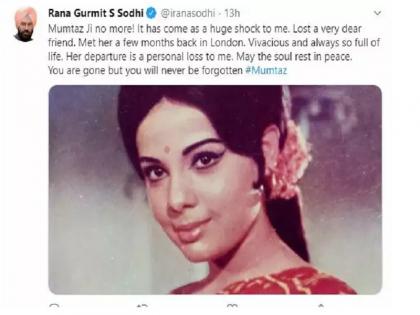 राणा गुरमित सोढी यांनी ट्विट केले की मुमताज जी आपल्यात नाही राहिल्या आहेत. माझ्यासाठी हा मोठा धक्का आहे. मी माझी अत्यंत जवळची मैत्रीण गमावली आहे. काही महिन्यांपूर्वी त्यांची लंडनमध्ये भेट झाली होती.  त्यांचे जाणे ही माझी वैयक्तिक हानी आहे. ईश्वर त्यांच्या आत्मास शांती देवो. तुम्ही निघून गेलात मात्र तुम्हाला कोणीच विसरु शकत नाही.