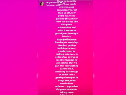 अभिनेत्रीने लिहिले की, 'अग्निपथ' करिअर बनवणे, रोजगार मिळवणे आणि पैसे कमवणे यापेक्षा अधिक आहे. कंगना रणौतने तिच्या इंस्टाग्राम स्टोरीमध्ये या योजनेचे उघडपणे समर्थन केले आहे. तिने पुढे लिहिले की, 'जुन्या काळी प्रत्येकजण गुरुकुलात जात असे आणि ही गोष्ट अगदी तशीच आहे.