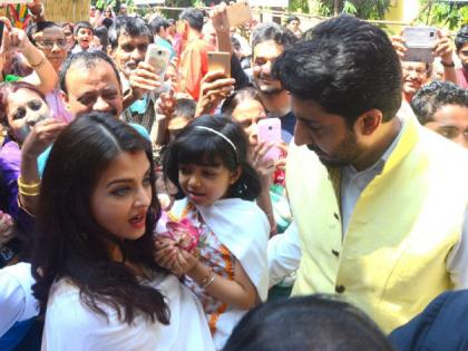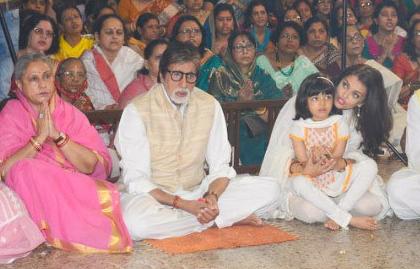 बच्चन कुटुंबिय धार्मिक कार्यक्रमांना हजेरी लावताना आपण सर्वांनिच पाहिले आहे. दुर्गापूजेसाठी बच्चन कुुटुंबियांनी मुंबईच्या दुर्गापूजा मंडळात उपस्थिती लावली. यावेळी अमिताभसह पत्नी जया, मुलगा अभिषेक, सून ऐश्वर्या, नातीन आराध्यासह मुलगी श्वेता यांनी हजेरी लावली. संपूर्ण बच्चन कुुटुंबिय पारंपारिक ड्रेसमध्ये दिसले.