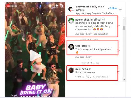 "बॉलिवूडकडे आता काही राहिलेलं नाही. म्हणून मराठी गाणी चोरत आहेत", अशी कमेंट एकाने केली आहे. तर दुसऱ्याने "हे ठिक आहे...पण ओरिजनलच चांगलं होतं", असं म्हटलं आहे. "काय दिवस आलेत...मराठी गाण्यांचा रिमेक करावा लागत आहे", "मराठी व्हर्जन चांगलं होतं", "चांगल्या गाण्याची वाट लावली", असं म्हणत प्रेक्षकांनी ब्रिंग इन ऑनच्या बॉलिवूडवर रिमेकवर नाराजी व्यक्त केली आहे.