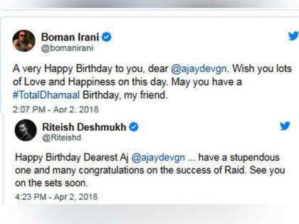 दरम्यान, अजयच्या वाढदिवसानिमित्त इंडस्ट्रीतील अनेक बड्या स्टार्सनी त्याला शुभेच्छा दिल्या. रितेश देशमुख, विवेक ओबरॉय यांच्यासह बोमन ईरानी यांनी ट्विटरच्या माध्यमातून अजयला शुभेच्छा दिल्या. काही दिवसांपूर्वीच अजयचा ‘रेड’ हा चित्रपट प्रदर्शित झाला. सध्या त्याचा हा चित्रपट बॉक्स आॅफिसवर चांगली कमाई करीत आहे. शंभर कोटींच्या क्लबमध्ये सहभागी होण्यासाठी हा चित्रपट काही पावलेच दूर आहे.