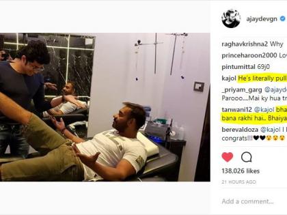 या फोटोमध्ये क्लिनिक पोहोचलेला अजय देवगण बेडवर झोपलेला आहे आणि डॉक्टर त्याच्या उजवा पाय उचलून त्याला तपासत आहेत. वास्तविक हा फोटो खूपच सिम्पल आहे. परंतु त्याची पत्नी काजोलने या फोटोवर एक अशी कॉमेण्ट पोस्ट केली ज्यामुळे हा फोटो आता फनी दिसत आहे. काजोलने अजयने शेअर केलेल्या फोटोला कॉमेण्ट दिली की, ‘ते तर खरोखरच तुझी टांग खिचत आहेत.’ काजोलच्या या कॉमेण्टनंतर अजयचा हा फोटो सर्वत्र ट्रोल होत आहे. कारण काजोलच्या या कॉमेण्टनंतर अन्य यूजर्सही काजोलच्या सपोर्टमध्ये बोलताना दिसत आहेत. एका यूजरने लिहिले की, ‘काजोल वहिणीने चांगलीच पकड निर्माण केली... भावावर @अजय देवगण!’