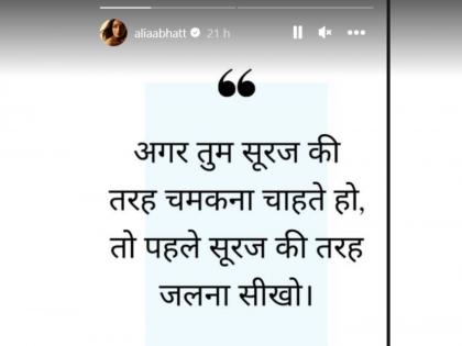 आता आलियाने भटने नुकतंच तिच्या इन्स्टाग्रामवर एक स्टोरी शेअर केली. या स्टोरीमधून तिने सासूला उत्तर दिल्याचं नेटकरी म्हणाले आहेत. आलियाने शेअर केलेल्या स्टोरीमध्ये एपीजे अब्दुल कलाम यांचा एक सुविचार आहे. 'अगर तुम सूरज की तरह चमकना चाहते हो, तो पहले सूरज की तरह जलना सीखो.'