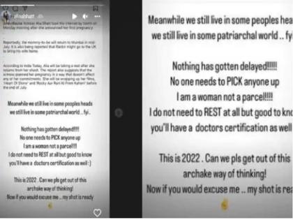 रणबीर आलियाला घ्यायला जाणार, ही रिपोर्टमधली गोष्ट आलियाला सर्वाधिक खटकली. तिने एक खास इन्स्टाग्राम स्टोरी सुद्धा शेअर केली. ‘आपण आजही पितृसत्ताक समाजात राहतो. तुमच्या माहितीसाठी सांगते, पण काहीच बदल झाले नाहीयेत, कशालाच उशीर झाला नाहीये. कोणीही मला घ्यायला येणार नाहीये. कोणीच मला पिक अप करायची गरज नाहीये. मी एक स्त्री आहे पार्सल नाही. मला आरामाची गरज नाहीये. पण ऐकून बरं वाटलं की तुमच्यापैकी काही जणांकडे डॉक्टरचं सर्टिफिकेशन आहे. हे 2022 आहे, आपण या जुन्या विचारसरणीतून बाहेर येऊ शकतो का? अॅण्ड एक्सक्यूज मी... कारण माझा शॉट रेडी आहे,’ अशा आशयाची इन्स्टास्टोरी तिने शेअर केली आहे. सध्या आलिया ‘हार्ट ऑफ स्टोन’ या हॉलिवूड चित्रपटाचं शूटींग करत आहे. या नाराजी व्यक्त करणाºया पोस्टआधी आलियाने शुभेच्छा देणाºया सर्वांचे आभार मानले होते.