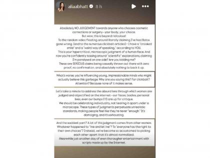 आलिया भटने सोशल मीडियावर मोठी पोस्ट शेअर केली. ती लिहिते, "कॉस्मेटिक करेक्शन किंवा सर्जरी ही प्रत्येकाची वैयक्तिक चॉईस आहे. यावरुन जजमेंट करणं योग्य नाही. तुमचं शरीर, तुमची इच्छा आहे की तुम्हाला काय करायचं आहे. काही लोक व्ह्यूजसाठी वाटेल ते कमेंट करतात. मी बोटॉक्स सर्जरी केली आणि ती फेल झाली असं लोक माझ्याबद्दल बोलत आहेत. माझी स्माईल वाकडी आहे, तुम्ही लोक असं म्हणत आहात जसं काय मला लकवा लागला आहे. अशा प्रकारच्या गोष्टी करणं चुकीचं आहे."