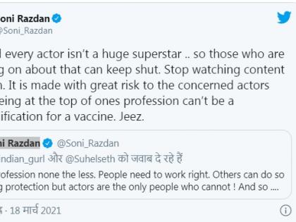 बिझनेसमॅन सुहैल सेठ यांच्या पोस्टला रिप्लाय करताना सोनी यांनी फिल्मी कलाकारांना तातडीने लस देण्याची विनंती केली आहे.