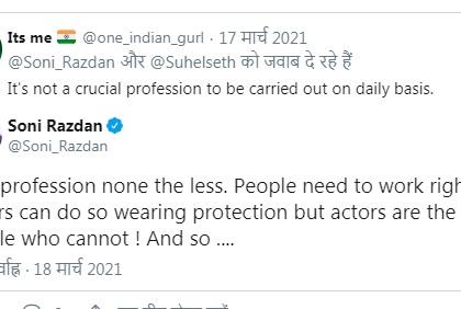 ‘सरकारने कलाकारांना तातडीने लस द्यायला हवी. कारण कलाकार मास्क घालू शकत नाहीत. हे काम नाही, पेशा आहे. दुसरे लोक स्वत:ची सुरक्षा करू शकतात. पण फक्त कलाकार स्वत:ची सुरक्षा करू शकत नाही,’ असे सोनी यांनी लिहिले.