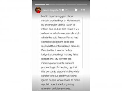 अमीषा पटेलने सोशल मीडियावर एक पोस्ट शेअर करत हे सर्व आरोप फेटाळून लावले आहेत. अमीषाच्या म्हणण्यानुसार, हे प्रकरण जुनं आहे आणि पवन वर्मासोबत यापूर्वीच 'सेटलमेंट' झाली आहे. इतकंच नव्हे त्याने पत्रावर सही करून पूर्ण रक्कम स्वीकारली होती. "केवळ प्रसिद्धी मिळवण्यासाठी आणि खोटे आरोप लावून हे नाटक रचले जात आहे. अशा लोकांमुळे मी माझ्या कामावर परिणाम होऊ देणार नाही," असे तिने स्पष्ट केले. तसेच, आपल्या वकिलांमार्फत पवन वर्मा याच्या विरोधात फसवणुकीची कायदेशीर कारवाई करणार असल्याचेही तिने सांगितले आहे.