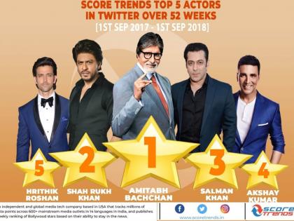 स्कोर ट्रेंड्स इंडियाच्या वार्षिक चार्टच्यानुसार, गेल्या 52 आठवड्यांमध्ये ट्विटरवर लोकप्रियतेत अमिताभ बच्चन पहिल्या स्थानी तर, किंग खान शाहरूख दूस-या क्रमांकावर, सलमान खान तिस-या, अक्षय कुमार चौथ्या आणि ऋतिक रोशन लोकप्रियतेत पाचव्या पदावर होते.