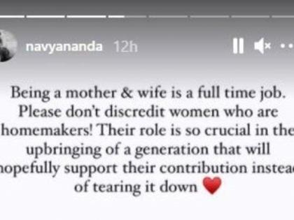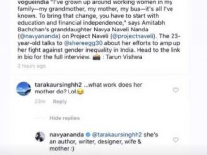 ‘हिची आई (श्वेता बच्चन) काय काम करते?’ अशी खिल्ली उडवणारी कमेंट तिने केली. या महिला युजरला श्वेताने नाही तर नव्या हिनेच सणसणीत उत्तर दिले. माझी आई एक लेखिका, डिझाईनर, पत्नी व आई आहे, असे नव्याने उत्तरादाखल लिहिले. याचा स्क्रिनशॉट नव्याने आपल्या इन्स्टास्टोरीवरही लावला.