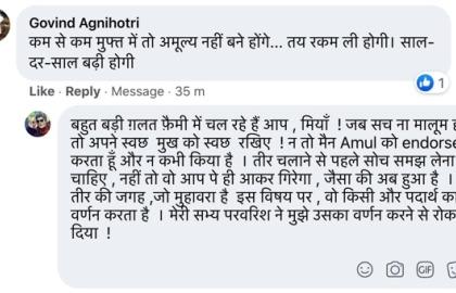 ‘मुफ्त में तो अमूल्य नहीं बने होंगे... तय रकम ली होगी... हर साल बढी होगी,’ अशा शब्दांत या युजरने अमिताभ यांना ट्रोल केले. त्याची ही कमेंट पाहून अमिताभ यांचा पारा चढला. यानंतर त्यांनी या ट्रोलरचा खरपूस समाचार घेतला. ‘बहुत बडी गलतफहमी में चल है है आप मियां... जब सच ना मालून हो तो अपने स्वच्छ मुख को स्वच्छ रखिए’, असे उत्तर त्यांनी दिले.