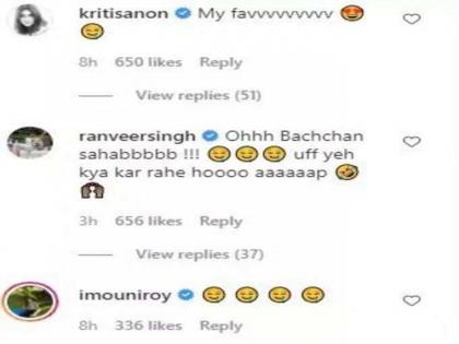 अभिनेत्री कृती सॅननने लिहिले की, माझं फेवरेट. तर अभिनेता रणवीर सिंहने लिहिले की, 'ओह बच्चन साहब!!! उफ्फ ये क्या कर रहे हो आप?. तर अभिनेत्री मौनी रॉयने लाळ गाळत असलेला इमोजी कमेंट केला.