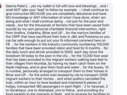 आपल्या ब्लॉगमध्ये त्यांनी भलीमोठी यादी मांडली. त्यांनी लिहिले, ‘लॉकडाऊन काळात रोज 5000 लोकांना दुपारचे व रात्रीचे भोजन दिले. मुंबईहून जाणा-या 1200 स्थलांतरित मजुरांना जोडे-चपला दिल्या. बिहार व युपीत जाऊ इच्छिणाºया मजुरांसाठी बसगाड्यांची सोय केली. 2009 स्थलांतरितांसाठी तर संपूर्ण ट्रेन बुक केली होती. मात्र राजकारणामुळे ही ट्रेन रद्द झाली तेव्हा इंडिगोच्या 6 विमांनाद्वारे 180 मजुरांना त्यांच्या घरी पोहोचवले. आपल्या खर्चाने 15000 पीपीई किट्स दिल्यात. 10000 मास्क दिलेत. दिल्लीत शिख समुदायाच्या अध्यक्षांना मोठी देणगी दिली. कारण ते गरिबांना भोजन पुरवत आहेत. मी बोलत नाही तर करतो. हेच माझे तत्त्व आहे. पण आज तुम्ही मला बोलायला भाग पाडले. मला माझ्या दानाबद्दल स्पष्टीकरण द्यावे लागतेय, याचे मला दु:ख आहे.’
