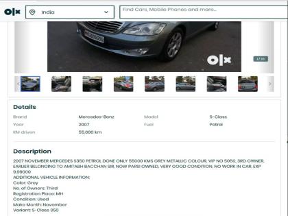 अमिताभ बच्चन यांना गाड्यांचे प्रचंड वेड असून त्यांच्याकडे अनेक गाड्या आहेत. त्यांच्या सगळ्याच गाड्या या प्रचंड महागड्या असून त्यांच्या एका कारच्या विक्रीची जाहिरात एका अॅपवर पाहायला मिळत आहे. या कारचे फोटो सध्या सोशल मीडियावर चांगलेच व्हायरल झाले आहेत. अमिताभ यांची मर्सडीज बेन्ज़ एक एस क्लास ही गाडी विकण्यासाठी ओएलक्सवर जाहिरात करण्यात आली असून या कारची किंमत ९.९९ लाख रुपये आहे. अमिताभ यांची गाडी विकली जात आहे हे कळल्यापासून त्यांच्या फॅन्समध्ये ही कार घेण्यासाठी चढाओढ सुरू आहे.