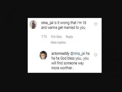 माधवनच्या या फोटोवर त्याचे चाहते भरभरून प्रतिक्रिया देत आहेत. या प्रतिक्रियांमधील एका प्रतिक्रियेने सगळ्यांचे लक्ष वेधून घेतले आहे. त्याच्या एका फॅनने या फोटोवर कमेंट देताना चक्क माधवनला प्रपोज केले आहे. तिने लिहिले आहे की, मी केवळ १८ वर्षांची आहे. पण मला तुझ्याशी लग्न करायचे आहे. माधवनने त्याच्या या फॅनला एक खूपच क्यूट रिप्लाय दिला आहे. त्याने रिप्लायमध्ये लिहिले आहे की, हा.. हा... हा... देव तुझे भले करो आणि तुला अतिशय चांगला मुलगा मिळो...