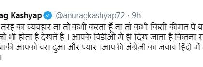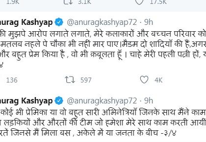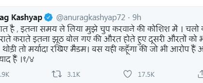 क्या बात है, मला चूप करण्यासाठी इतका वेळ घेतला. काही हरकत नाही. पण मला चूप करण्यासाठी इतके खोटे बोललात की, दुस-या महिलांनाही यात ओढले. थोडी मर्यादा ठेवा मॅडम. मी फक्त एवढेच म्हणेल की, जे काही आरोप आहेत ते सगळे निराधार आहेत, असे पहिले ट्विट अनुरागने केले.