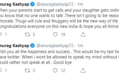 ‘जेव्हा तुमच्या आई-वडिलांचा फोन येऊ लागतात. तुमच्या मुलीला धमक्या मिळतात, यावरून या मुद्यावर कोणालाच उघडपणे बोलायचे नाही, हे स्पष्ट होते. भामटे राज्य करतील आणि हीच जीवन जगण्याची नवी पद्धत होईल. सर्वांना नव्या भारतासाठी शुभेच्छा. हे माझे अखेरचे ट्विट आहे. कारण मी माझे ट्विटर अकाऊंट बंद करतोय. मला माझे विचार निर्भीडपणे मांडता येत नसतील तर मी आता बोलणारच नाही. गुड बाय...,’असे अखेरचे ट्विट करत, अनुरागने स्वत:चे ट्विटर अकाऊंट डिलीट केले.
