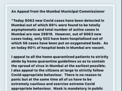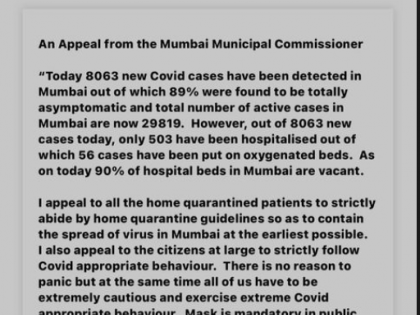 पोस्टनुसार, बृहन्मुंबई महानगरपालिकेचे आयुक्त इक्बाल चहल यांनीही होम क्वारंटाईन केलेल्या सर्व रुग्णांना संसर्गाचा पुढील प्रसार होण्याचा धोका कमी करण्यासाठी मार्गदर्शक तत्त्वांचे काटेकोरपणे पालन करण्याचे आवाहन केले.शेवटी, पोस्टमध्ये म्हटले आहे की आत्ता घाबरण्याची वेळ नाही, तरीही परिस्थिती आणखी बिघडू नये म्हणून आपण सर्वांनी अत्यंत सावधगिरी बाळगणे आवश्यक आहे.