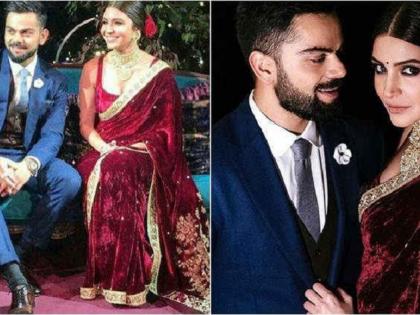 रिंग सेरेमनीत अनुष्काने वेल्वेट मरून साडी निवडली होती. साडीवर मोती आणि जरदोजी व मरोरी वर्क होते. यावेळी तिने घातलेल्या गळ्यातील सेटवर पर्ल चोकरसोबत डायमंडचे काम केले गेले होते. कानात मॅचिंग स्टड, केसांचा अंबाडा आणि त्यावर खोचलेले गुलाबाचे फुल अशा लूकमध्ये अनुष्का कमालीची सुंदर दिसत होती.