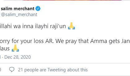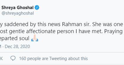 प्रसिद्ध संगीतकार ए. आर. रेहमान यांच्या मातोश्री करीमा बेगम यांचे निधन झाले आहे. मागील काही दिवसांपासून त्या आजारी होत्या सोमवारी चेन्नईत त्यांनी अखेरचा श्वास घेतला. रेहमान यांनी आपल्या आईचा फोटो सोशल मीडियावर पोस्ट करत निधनाची बातमी सांगितली. गायिका श्रेया घोषाल, दिग्दर्शक शेखर कपूर, गायक-संगीतकार सलीम मर्चंट, दिग्दर्शक मोहन राजा, गायिका हर्षदीप कौर यांच्यासह कलाक्षेत्रातील अनेकांनी सोशल मीडियाद्वारे शोक व्यक्त केला.