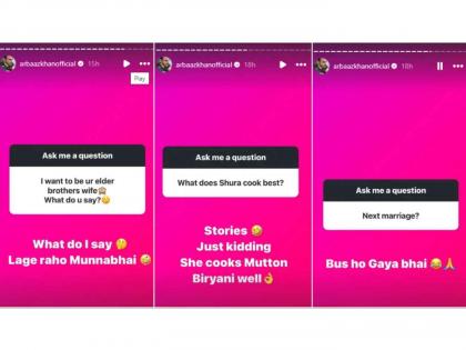 याबरोबरच अरबाजला चाहत्यांनी त्याची पत्नी शूरा हिच्याबाबतही प्रश्न विचारले. "शूरा काय चांगलं बनवते?" असा प्रश्न अरबाजला विचारला. यावर तो उत्तर देत म्हणाला, "ती मटण बिर्याणी छान बनवते". एका चाहत्याने अरबाजला "पुढचं लग्न?" असा प्रश्नही विचारला होता. यावर त्याने "बस हो गया भाई" असं म्हणत हसण्याचे इमोजी पोस्ट केले.