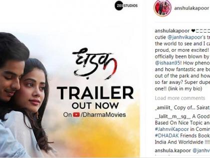 अंशुला कपूरने ‘वाह, क्यूटी... ’ इथपासून सुरूवात केली. ‘आहहा मेरी क्यूटी, जान्हवी जगासाठी तुझ्या चित्रपटाचा ट्रेलर आऊट झालाय आणि माझा ऊर आनंदाने आणि अभिमानाने भरून येतोय. ट्रेलमधील जानू आणि ईशान तुम्हा दोघांना बघून मी अक्षरश: तुमच्यावर भाळले आहे. ट्रेलर शानदार आहे. २० जुलै इतकी लांब का आहे. ‘धडक’साठी मी सुपरडुपर एक्साईटेड आहे,’ असे अंशुलाने लिहिले आहे. अंशुलाच्या या मॅसेला रिप्लाय करताना जान्हवीने ‘आय लव्ह यू’ म्हटले आहे.