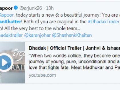 ‘धडक’च्या ट्रेलरमध्ये तू आणि ईशान खट्टर दोघेही कमालीचे सुंदर दिसत आहात. तुला आणि ‘धडक’च्या संपूर्ण टीमला शुभेच्छा’, असे त्याने लिहिलेयं. काल ट्रेलर लॉन्चपूर्वीही अर्जुनने जान्हवीसाठी एक इमोशनल पोस्ट लिहिली होती. मी मुंबईत तुझ्यासोबत नाही, यासाठी माफी मागतो. पण मी कायम तुझ्या सोबत आहे. जराही चिंता करू नकोस, असे त्याने तिला मध्ये लिहिले होते.