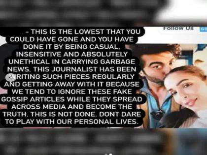 मलायका प्रेग्नंट असल्याची चर्चा सुरू झाली आणि अर्जुन कपूर संतापला. इन्स्टास्टोरीवर त्याने आपला हा संताप व्यक्त केला. ‘हा प्रकार अतिशय खालच्या दर्जाचा आहे आणि तुम्ही हे सगळं सहज करत आहात. अशा कचरा बातम्या चालवणं अतिशय अनैतिक व असंवेदशनशील प्रकार आहे. काही पत्रकार अशाप्रकारच्या बातम्या सतत पसरवत आहेत आणि आम्ही दुर्लक्ष करतो म्हणून ते मर्यादा लांघताना दिसत आहेत. हे अयोग्य आहे. आमच्या खासगी आयुष्याशी खेळण्याची हिंमत करू नका...,’अशा आशयाची इन्स्टा स्टोरी अर्जुनने शेअर केली आहे. यातून त्याचा संताप स्पष्ट दिसतोय.