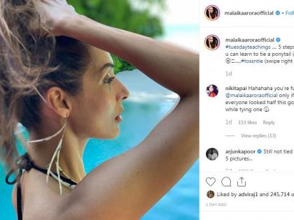सोशल मीडियावर अर्जुन आणि मलायका दोघेही अॅक्टिव्ह असतात. अर्जुनच्या फोटोवर मलायका तर मलायकाच्या फोटोंवर अर्जुन अनेक वेळा कमेंट्स करताना दिसतो. मलायकाने इन्स्टाग्रामवर पाच फोटोंची सिरीज करुन. त्यात तिने आपल्या फॅन्ससोबत केस बांधण्याच्या टीप्स दिल्या आहेत. या फोटोला तिने 'केस बांधण्याची कला पाच स्टेप्समध्ये जाणून घ्या' असे कॅप्शनदेखील दिले आहे. मलायकाच्या या फोटोवर अर्जुन कमेंट केली आहे. 'अर्जुनने लिहिले, हे पाच फोटोंनंतरही केस नाही बांधू शकलो.' अर्जुन कपूरसोबत मलायकाच्या इतर फॅन्सनीदेखील या फोटोवर कमेंट्स दिल्या आहेत. काहींनी तिला ट्रोलदेखील केले आहे.