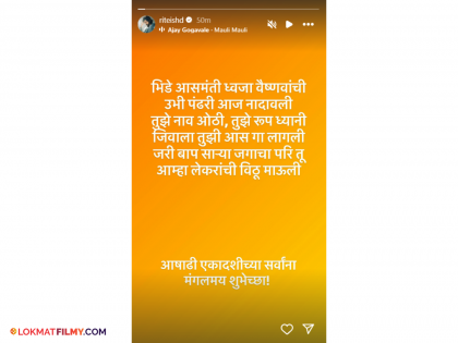 रितेश देशमुख याने इन्स्टाग्रामवर स्टोरी शेअर केली आहे. रितेशनं त्याच्या लई भारी चित्रपटातील 'माऊली माऊली' गाण्यातील काही ओळी पोस्ट केल्यात. त्यानं लिहलं, "भिडे आसमंती ध्वजा वैष्णवांची... उभी पंढरी आज नादावली... तुझे नाव ओठी, तुझे रूप ध्यानी, जिवाला तुझी आस गा लागली... जरी बाप साऱ्या जगाचा परि तू आम्हा लेकरांची विठू माऊली... आषाढी एकादशीच्या सर्वांना मंगलमय शुभेच्छा!".