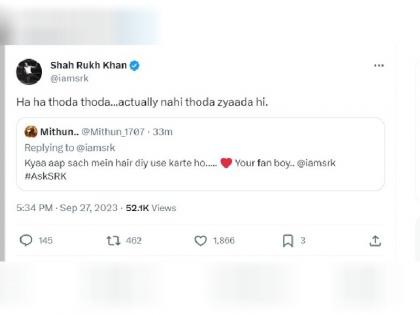 'तुम्ही खरंच हेअर डायचा वापर करता का?' असा प्रश्न एका चाहत्याने शाहरुखला विचारला. त्यावर, "हाहा..थोडा थोडा..नाही खरं तर खूप जास्त", असं उत्तर शाहरुखने दिलं. त्याच्या या उत्तरावरुन तो खरोखर केस काळे दिसावेत यासाठी हेअर डायचा वापर करतो हे त्याने कबूल केलं. त्याचं हे उत्तर ऐकल्यावर अनेकांनी त्याच्यावर कमेंटचा पाऊस पाडला आहे. तर, तो खरं बोलला यामुळे काहींनी त्याचं कौतुकही केलं आहे.