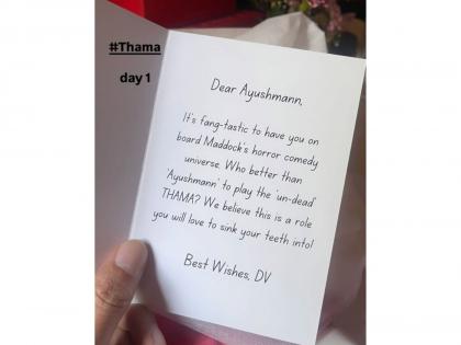 आयुषमान खुराणाने 'थामा'च्या शूटिंगला सुरुवात केली आहे. या खास प्रसंगी निर्माते दिनेश विजान यांनी अभिनेत्यासाठी एक पत्र पाठवले, ज्यात लिहिले आहे की, “मॅडॉकच्या हॉरर-कॉमेडी युनिव्हर्समध्ये तुझे स्वागत आहे. ‘अनडेड’ थामा साकारण्यासाठी आयुष्मानपेक्षा चांगला अभिनेता असूच शकत नाही! आम्हाला खात्री आहे की तुला या भूमिकेत काम करताना खूप मजा येईल.”