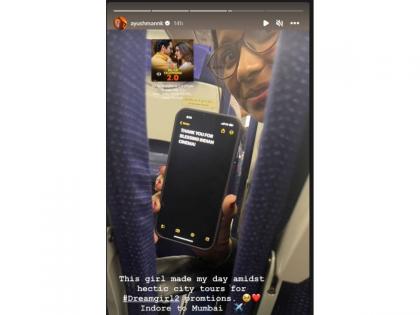 आयुष्मान इंदूर वरुन विमानाने मुंबईत येत होता. यावेळी त्याच्या समोरच्या सीटवर बसलेल्या महिलेने हळूच तिच्या मोबाईलमधला एक मेसेज दाखवला. काय आहे तो खास मेसेज? तर महिनेने मोबाईलवर 'भारतीय सिनेमासाठी वरदान ठरल्याबद्दल तुझे आभार' अशा आशयाचा मेसेज टाईप केला होता . तो मेसेज वाचून आयुष्मान भारावला. त्याने महिलेचा फोटो ट्वीट करत लिहिले, 'ड्रीम गर्ल 2 च्या प्रमोशनसाठी अनेक शहरात फिरत थकवणारे शेड्यूल असताना या मुलीने मात्र माझा दिवस खुश केला.'
