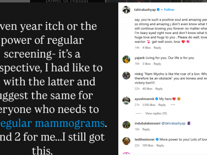 आयुषमानने ताहिराच्या पोस्टवर प्रतिक्रिया दिली आणि कमेंट सेक्शनमध्ये एक नोट लिहिली. यात शब्द कमी असतील, पण भावनाचं मोल जास्त आहे. "माझी हिरो",असं म्हणत त्याने रेड हॉर्ट एमोजी पोस्ट केलेत. ताहिराला २०१८ मध्ये पहिल्यांदाच स्तनाचा कर्करोग झाला होता. त्यावर तिने यशस्वीरित्या मात केली होती. आता पुन्हा कर्करोगाला लढा देण्यासाठी ती सज्ज आहे. ताहिरा ही एक लेखिका आणि दिग्दर्शक देखील आहे.