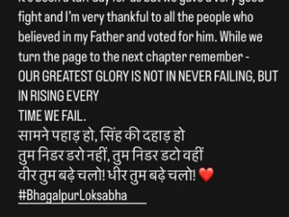 नेहा हिनं पुढे काही ओळी लिहल्या, 'सामने पहाड़ हो, सिंह की दहाड़ हो। तुम निडर डरो नहीं, तुम निडर डटो वहीं। वीर तुम बढ़े चलो! धीर तुम बढ़े चलो! #BhagalpurLoksabha'. नेहाची ही पोस्ट सध्या चांगलीच चर्चेत आली आहे. नेहा शर्माने भागलपूर लोकसभा मतदारसंघातून वडिलांसाठी मोठ्या प्रमाणावर प्रचार केला होता. काँग्रेस नेते राहुल गांधीदेखील अजीत शर्मा यांच्या प्रचारासाठी आले होते. पण, तरीही भागलपूर मतदारसंघातून एनडीए उमेदवार अजय कुमार मंडल विजयी झाले.