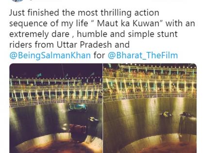 बॉलिवूडचा दबंग खान सलमान चित्रपटात असल्यावर जबरदस्त स्टंटस सीन्स बघायला मिळणार नाहीत, असे होणार नाही. सध्या सलमान खान सध्या आपल्या आगामी ‘भारत’ या चित्रपटाच्या शूटिंगमध्ये व्यस्त आहे. हा चित्रपट पुढच्या वर्षी ७ जूनला ईदच्या निमित्ताने रिलीज होणार आहे. चित्रपटात प्रेक्षकांना अनेक अॅक्शन सीन्स पाहायला मिळणार आहेत. चित्रपटात सलमान ‘मौत के कुएं’ मध्ये बाइक चालवताना दिसणार आहे. भारतचे डायरेक्टर अली अब्बास जफरने ट्वीट करुन याची माहिती दिली आहे.