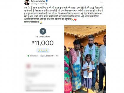 फेसबुकवर याबाबत माहिती देताना राकेश मिश्राने लिहिले की, 'नशिबावरही मात करत ती एक पायाने शाळेत जाते, तिला सलाम, ही मुलगी जी जमुई बिहारची रहिवासी आहे, तिचे नाव सीमा कुमारी आहे. मी एका कलाकार म्हणून नाही तर कुटुंबातील एक सदस्य म्हणून तुला मनापासून मदत देत आहे.तुझी आयुष्यात खूप प्रगती होवो, मनीष कश्यप भाऊ तुमचे आभार, तुम्ही या मुलीची आवाज बनलात आणि हे सर्वांपर्यंत पोहोचवले. अभिनेत्याने सीमाचा कौटुंबिक फोटो शेअर केला आहे तसेच 11000 रुपये ट्रान्सफर केल्याचा स्क्रीनशॉटही शेअर केला आहे. सोशल मीडियावर लोक या अभिनेत्याचे कौतुक करत आहेत.