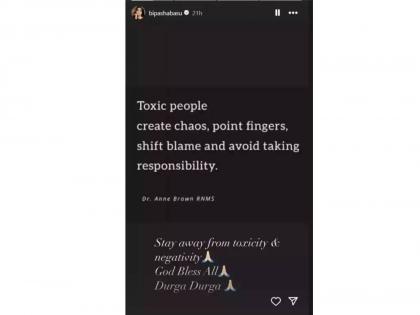 बिपाशाने तिच्या इन्स्टाग्राम स्टोरीमध्ये पोस्ट शेअर केली आहे. "टॉक्सिक लोक गोंधळ निर्माण करतात, दुसऱ्यांकडे बोट दाखवतात, दुसऱ्यांना दोष देतात आणि जबाबदारी घेणं टाळतात", असं बिपाशाने शेअर केलेल्या पोस्टमध्ये म्हटलं आहे. पुढे ती म्हणते, "नकारात्मकता आणि टॉक्सिसिटीपासून दूर राहा. दुर्गा दुर्गा". मिका सिंहच्या वक्तव्यानंतर बिपाशाच्या या पोस्टने चाहत्यांचं लक्ष वेधून घेतलं आहे.