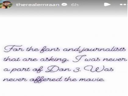 दरम्यान, नुकतीच अभिनेत्याने त्याच्या अधिकृत इंस्टाग्राम अकाउंटवरून याबाबत चाहत्यांना माहिती दिली आहे. आपण डॉन-३ या चित्रपटात काम करणार नसल्याचा खुलसा त्याने या पोस्टमधून केलाय. "काही चाहते तसेच पत्रकार मला वारंवार या चित्रपटासंदर्भात प्रश्न विचारत आहेत, मी डॉन-३ या सिनेमाचा भाग नव्हतोच. शिवाय या चित्रपटासाठी मला कधीही विचारणा झाली नाही." अशी माहिती इम्रानने दिली.