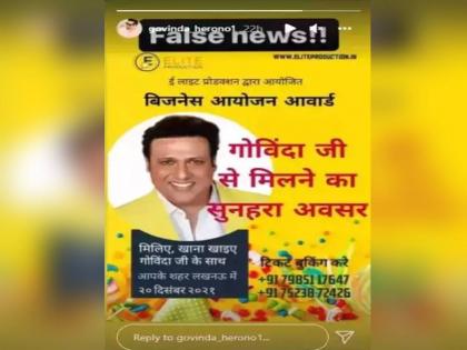'ई लाइट प्रॉडक्शनचा बिझनेस ऑर्गनायझिंग अवॉर्ड. गोविंदाजींना भेटण्याची सुवर्ण संधी. भेटा, गोविंदाजींसोबत जेवा. तुमच्या लखनौ शहरात.' यामध्ये 20 डिसेंबर रोजी होणाऱ्या कार्यक्रमाचे तिकीट बुक करण्यासाठी दोन मोबाईल क्रमांकही देण्यात आले आहेत.