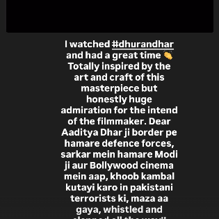 त्यानंतर कंगना रणौतने 'धुरंधर' चित्रपटाचे दिग्दर्शक आदित्य धर यांच्यावर कौतुकाचा वर्षाव केला.यासह तिने दिग्दर्शकाची पत्नी यामी गौतमचेही अभिनंदन केले.पुढे तिने लिहिलंय," प्रिय आदित्य धर, सीमेवर आपले संरक्षण दल, सरकारमध्ये आपले मोदीजी आणि बॉलिवूड सिनेमात तुम्ही, या पाकिस्तानी दहशतवाद्यांना अशीच चांगली धुलाई करत राहा. संपूर्ण चित्रपटादरम्यान शिट्ट्या आणि टाळ्या वाजत होत्या. प्रत्येकाचे काम अप्रतिम आहे, पण या चित्रपटाचा खरा धुरंधर हा स्वतः चित्रपट निर्माता आदित्य धर आहे. यामी गौतमचेही अभिनंदन...", अशा आशयाची पोस्ट तिने लिहिली आहे.