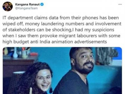 कंगना रणौतनं एका न्यूज पोर्टलच्या बातमीची लिंक शेअर केली आहे. "आयकर विभागानं दावा केलाय की त्यांनी फोनमधील डेटा साफ केला आहे. मनी लाँड्रिंग आणि त्यातील हिस्सा असलेल्या भागीदारीचा आकडा आश्चर्यकारक असून शकतो," असं त्यावर तिनं लिहिलं आहे. "मला पहिल्यापासूनत त्यांच्यावर संशय होता जेव्हा महागड्या राष्ट्रविरोधी जाहिरातींमधून त्यांना प्रवासी मजुरांना चिथावणी देताना पाहिलं होतं," असंही तिनं नमूद केलं आहे.