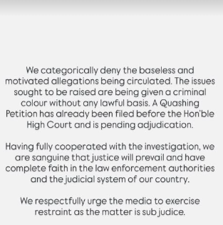 शिल्पा शेट्टीने शेअर केलेल्या या स्टोरीमध्ये म्हटलंय, "आमच्या विरोधात पसरवल्या जात असलेल्या निराधार अफवा आणि खोटे आरोप आम्ही स्पष्टपणे नाकारतो.जे काही मुद्दे उपस्थित केले जात आहे, त्यांना कोणताही कायदेशीर आधार नाही.या प्रकरणी उच्च न्यायालयात याचिका दाखल करण्यात आली असून, त्यावर सुनावणी सुरू आहे.या तपासात आम्ही पूर्ण सहकार्य केले आहे आणि आमचा न्यायव्यवस्थेवर पूर्ण विश्वास आहे." असं शिल्पाने म्हटलं आहे. त्याचबरोबर माध्यमांनाही या प्रकरणाबद्दल कोणती चुकीची माहिती पसरवू नये, अशी विनंती देखील त्यांनी केली आहे.